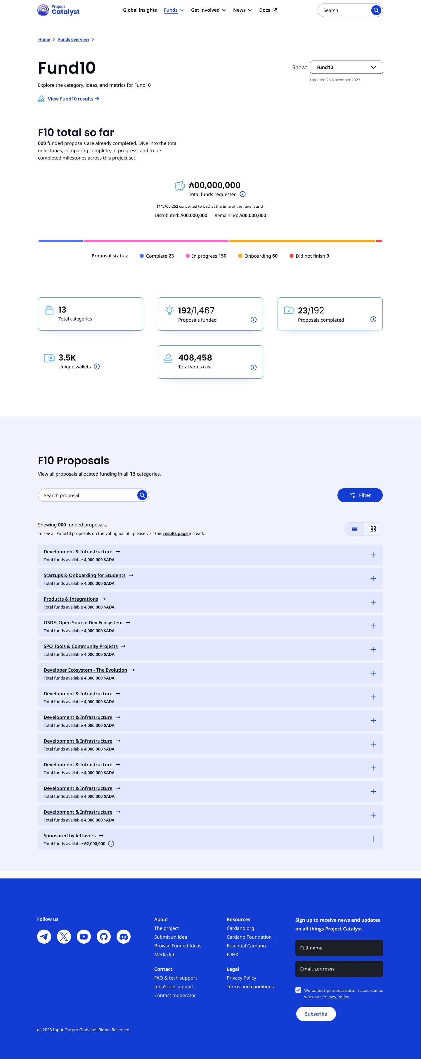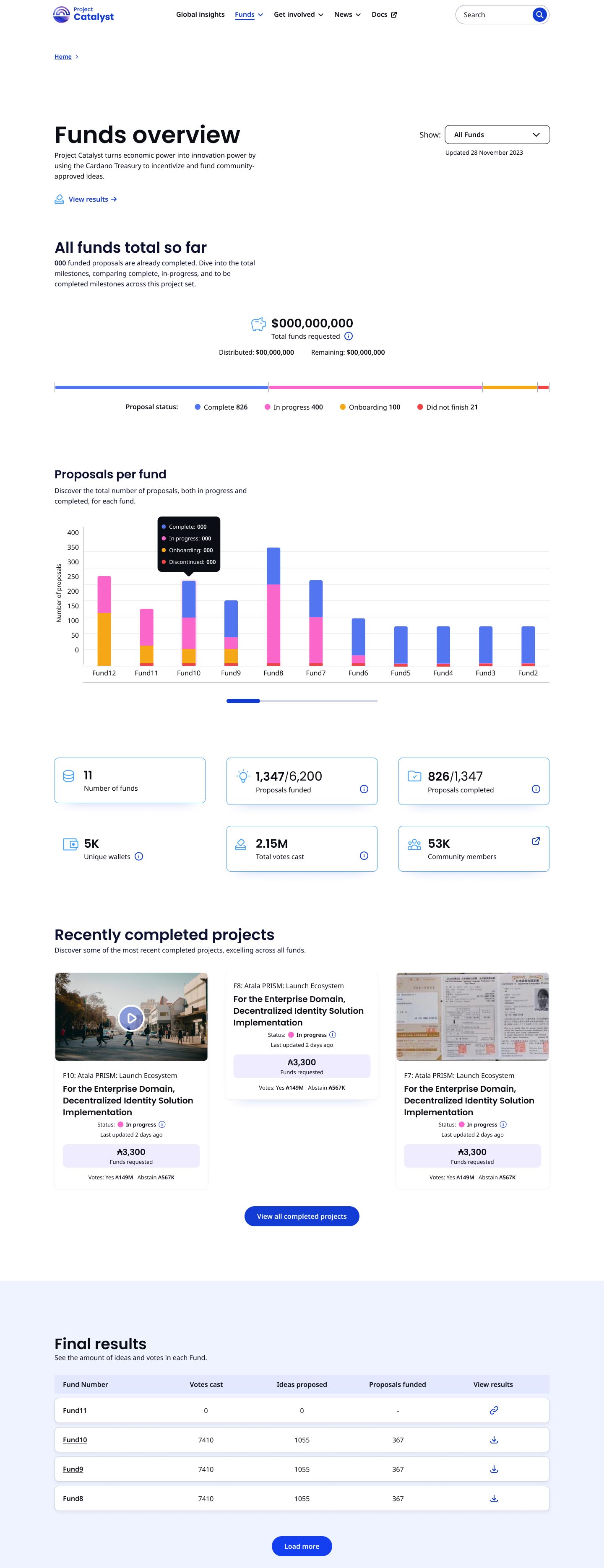 The dataset included figures and context around project details, country of origin, milestones, ADA distribution, and fund performance, to name a few. I worked closely with the client to identify which data was most important to surface and how best to display it. Together, we defined the content and structure of a user-friendly dashboard that could clearly communicate the key insights.